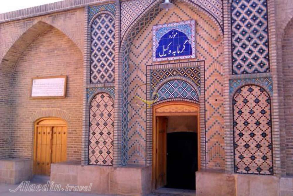 حمام تاریخی وکیل با یازده هزار متر مربع مساحت و حدود نه هزار متر مربع زیربنا از وسیعترین حمامهای ایران است که در غرب مسجد وکیل واقع شده است. این بنا با معماری اصولی، پیشرفته و زیبایی که دارد در فهرست آثار ملی ایران ثبت شده است. به دلیل مقاومت بالای آهک در برابر رطوبت، در تزئینات حمام و بخشهای داخلی، به جای گچ از آهک استفاده شده است. نقش و نگارهایی از فرهنگ و تمدن ایران دوران باستان روی دیوارهای حمام نقش بسته است. تصاویر روی دیوارها مضامین متنوعی دارند که از آن جمله میتوان به داستانهای قرآنی همچون قربانی کردن حضرت اسماعیل، معراج پیامبر (ص)، به چاه انداختن حضرت یوسف اشاره کرد.