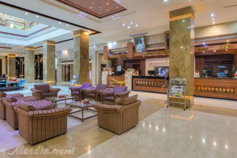 یکی از مهمترین دلایلی که این هتل پنجستاره، در میان مسافران مشهد، هتلی محبوب به شمار میآید، فضای سبز بزرگ آن است که میتوانید با قدمزدن در آن آرامش را تجربه کنید. به لابی بزرگ این هتل که پا بگذارید، خطوط زیبایی به رنگ مسی را بر دیوارهها و زمینههای سبز آبی خواهید دید که بر بالای آنها نقشبرجستهای از شاعرانی همچون فردوسی، ورود شما را به سرزمین شاعران پارسیگوی خوشامد میگویند. در همین لابی روبروی خود، یک کافیشاپ با دکوراسیون گلوگیاه خواهید دید تا بهمحض ورود بتوانید خستگی سفر را با قهوه یا دمنوشی طبیعی از تن به در کنید. از پلهها که بالا بروید نیز یک نیمطبقه قرار گرفته که گهگاهی برای برگزاری مراسم از آن استفاده میشود و فروشگاههای مختلفی در آن قرار گرفتهاند.